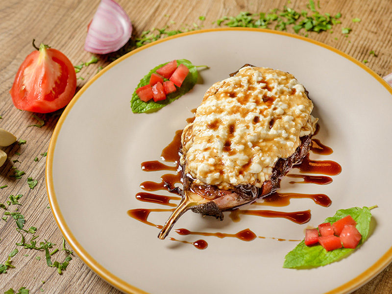 with caramelized onions, flavored with mint and feta mousse